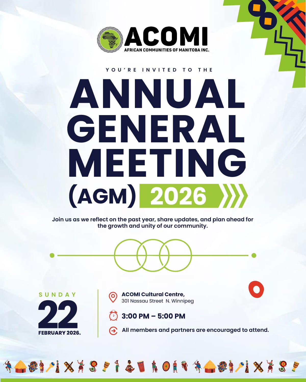 You are warmly invited to attend the Annual General Meeting of the African Communities of Manitoba Inc. (ACOMI). Date: Sunday, February 22, 2026 Time: 3:00 PM – 5:00 PM Venue: […]